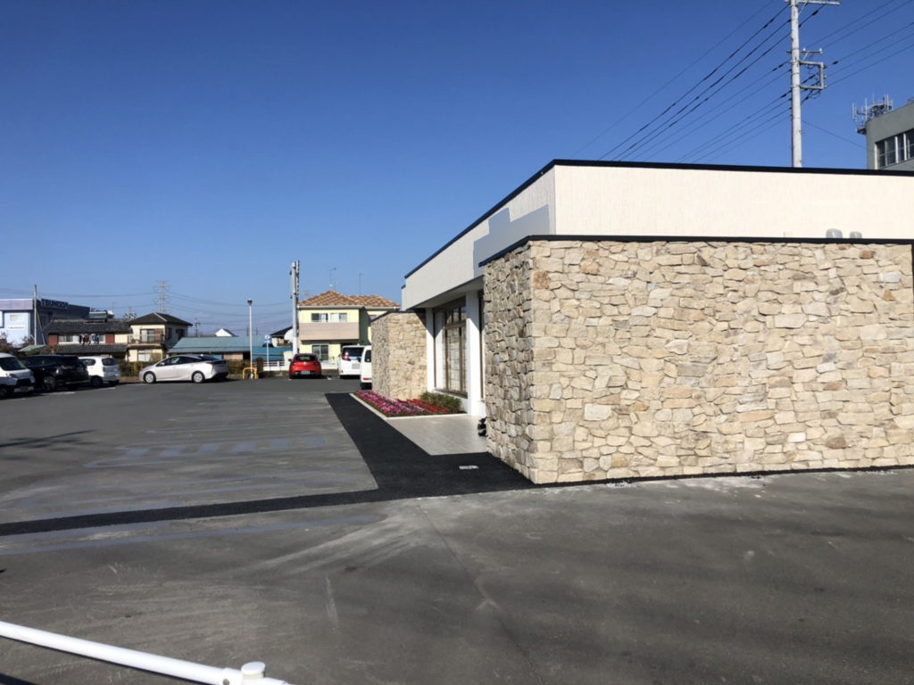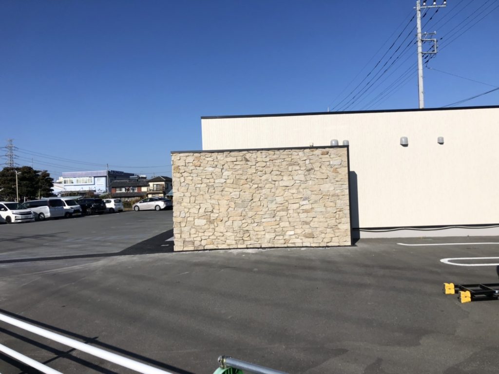 お店を認識するアイキャッチにもなる高さ3mの石張りのグランドアートウォールが完成です。
