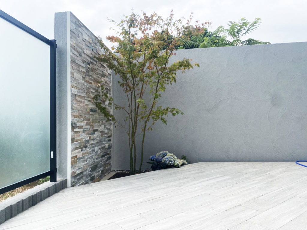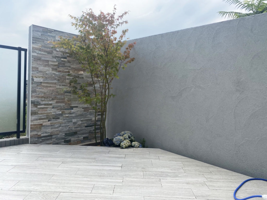 デッキスペースの目隠し塀をグランドアートウォールにて施工。